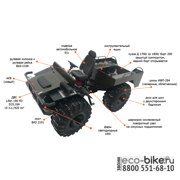 • Габариты вездехода: длина (4000 мм), ширина (1980 мм), высота (1800 мм). Вездеход обшит композитом.